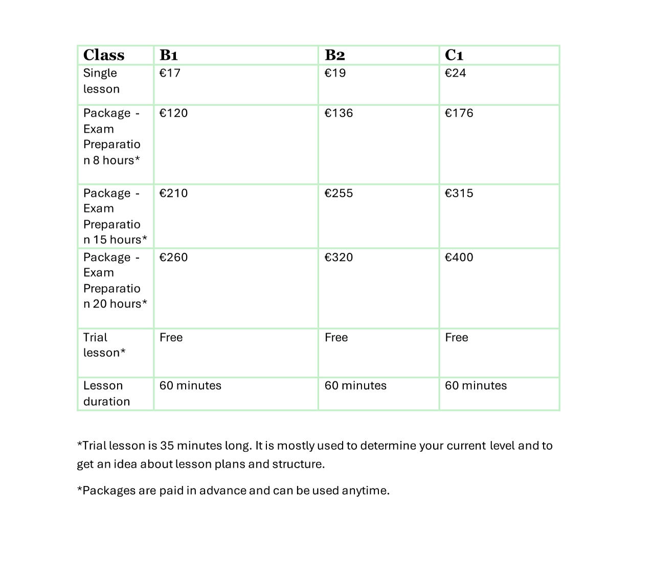 Frequently Asked QuestionsQ. What is a typical lesson like?A. All lessons are held online in real time with a qualified Cambridge exam teacher. You will receive personalized feedback and targeted exam strategies during each session.Q. Is there a fee for weekend lessons?A. No. There is no extra price for weekend lessons, lessons can be held during a weekend as any other time.Q. Do I need to buy books from you?A. No. You do not need to buy any books, we use official materials, preparation materials and all is being shared during the lesson.Q. What happens if I need to cancel or reschedule a class?A. If you need to cancel or reschedule a lesson, we kindly ask you do so up to 12 hours prior to the lesson. The fee for the lesson will be moved to the following lesson, you will not be charged twice.